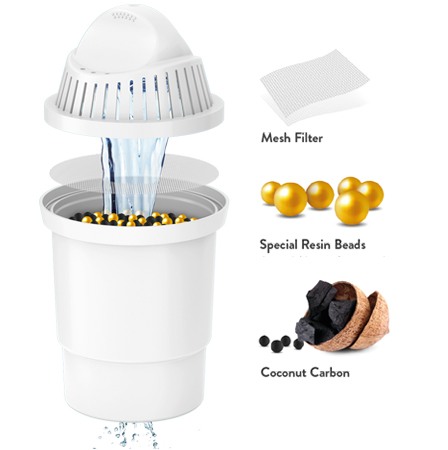 - O rășină specială schimbătoare de ioni ajută la prevenirea depunerilor de calcar și reduce metalele grele.
